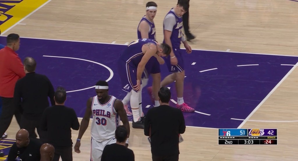 However, things would take a bit of a worrisome turn with 3:03 left in the half. JJ Redick called a timeout and Luka would be seen hunched over in front of the Sixers bench grimacing with some pain.
