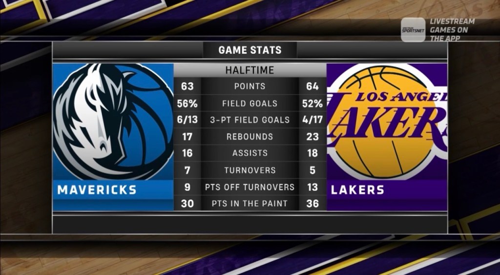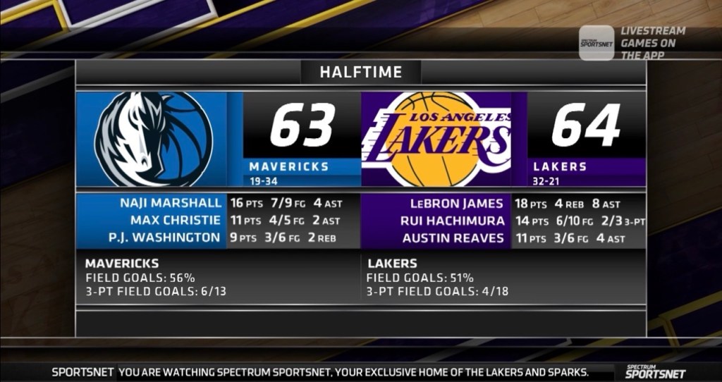 The Lakers were able to build a rhythm early behind LeBron James and contributions from Rui Hachimura and Austin Reaves. However, a second quarter surge by the Mavericks closed the first half and trimmed the Laker lead to one, 63-64.