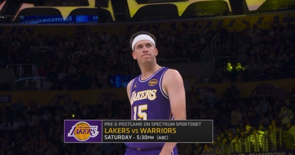 LOS ANGELES — Austin Reaves checks into the game with 2:05 to go in the first quarter, Credit: Spectrum SportsNet
