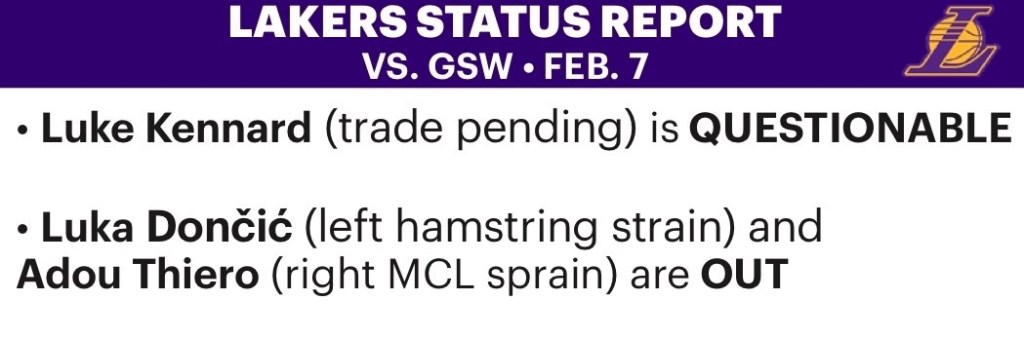 Luka Dončić and Adou Thiero listed as OUT for Saturday night’s matchup versus the Golden State Warriors. Luke Kennard listed as QUESTIONABLE